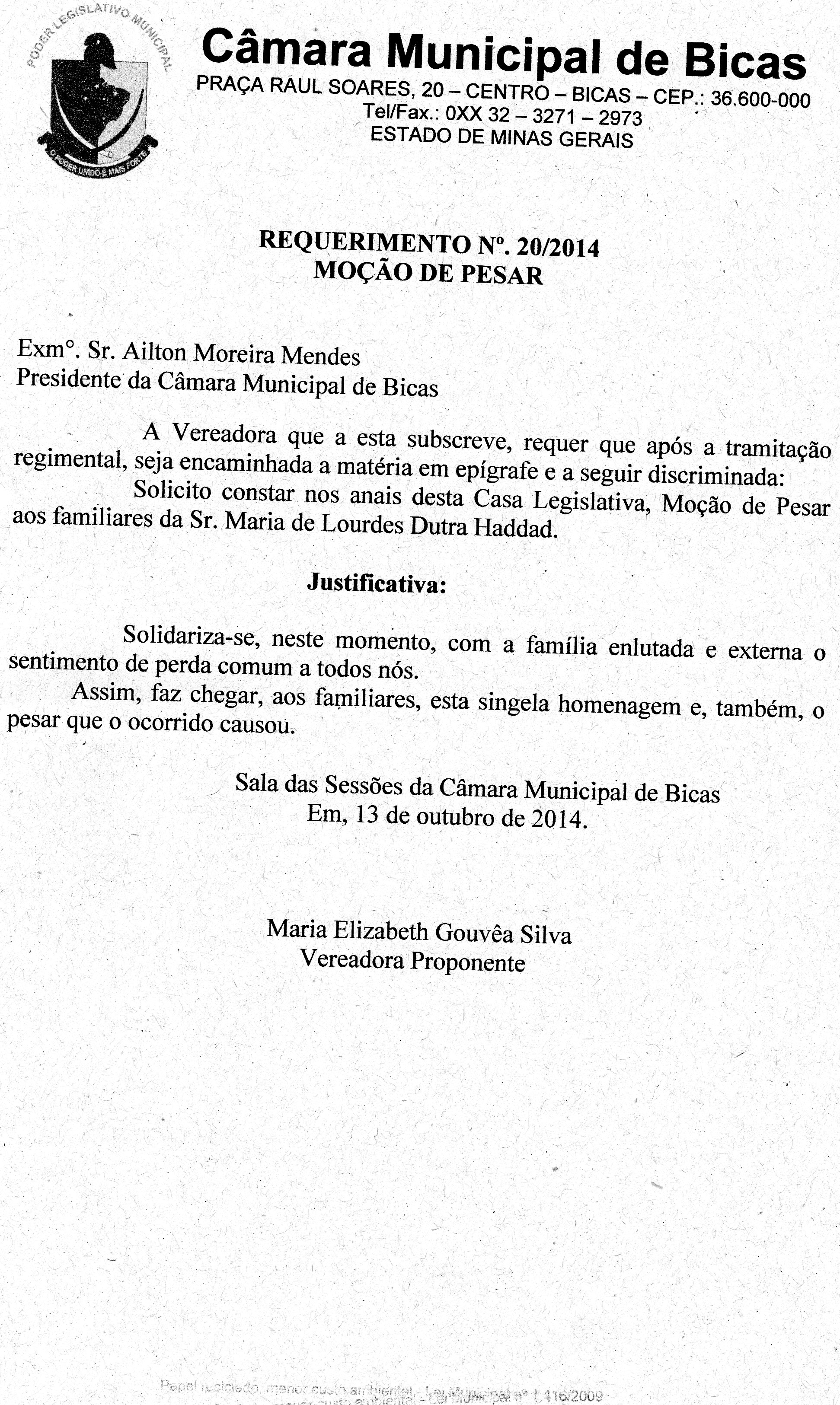 ![]() MOÇÃO DE PESAR- MARIA DE LOURDES DUTRA HADDAD