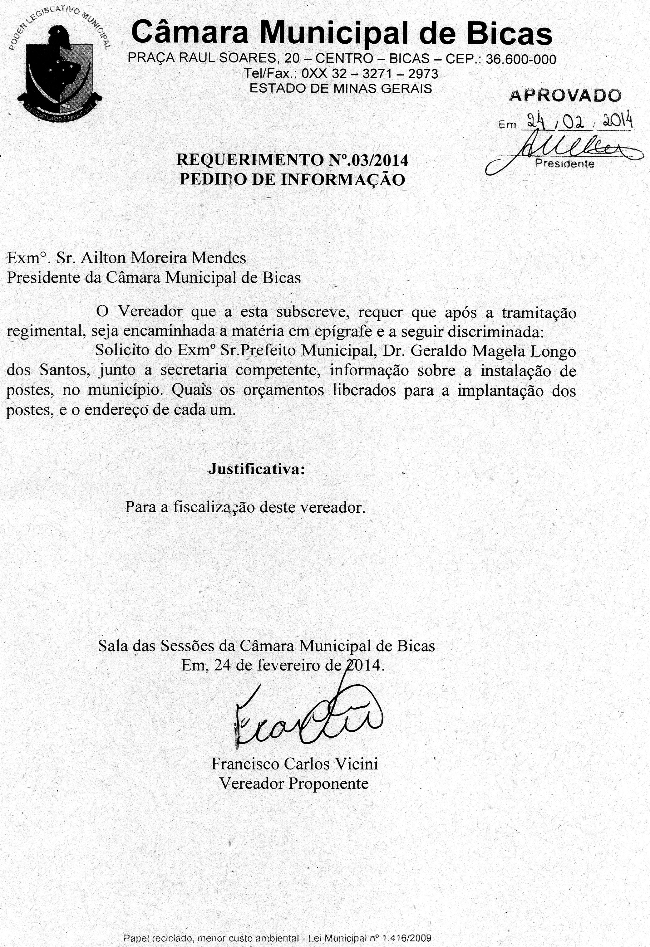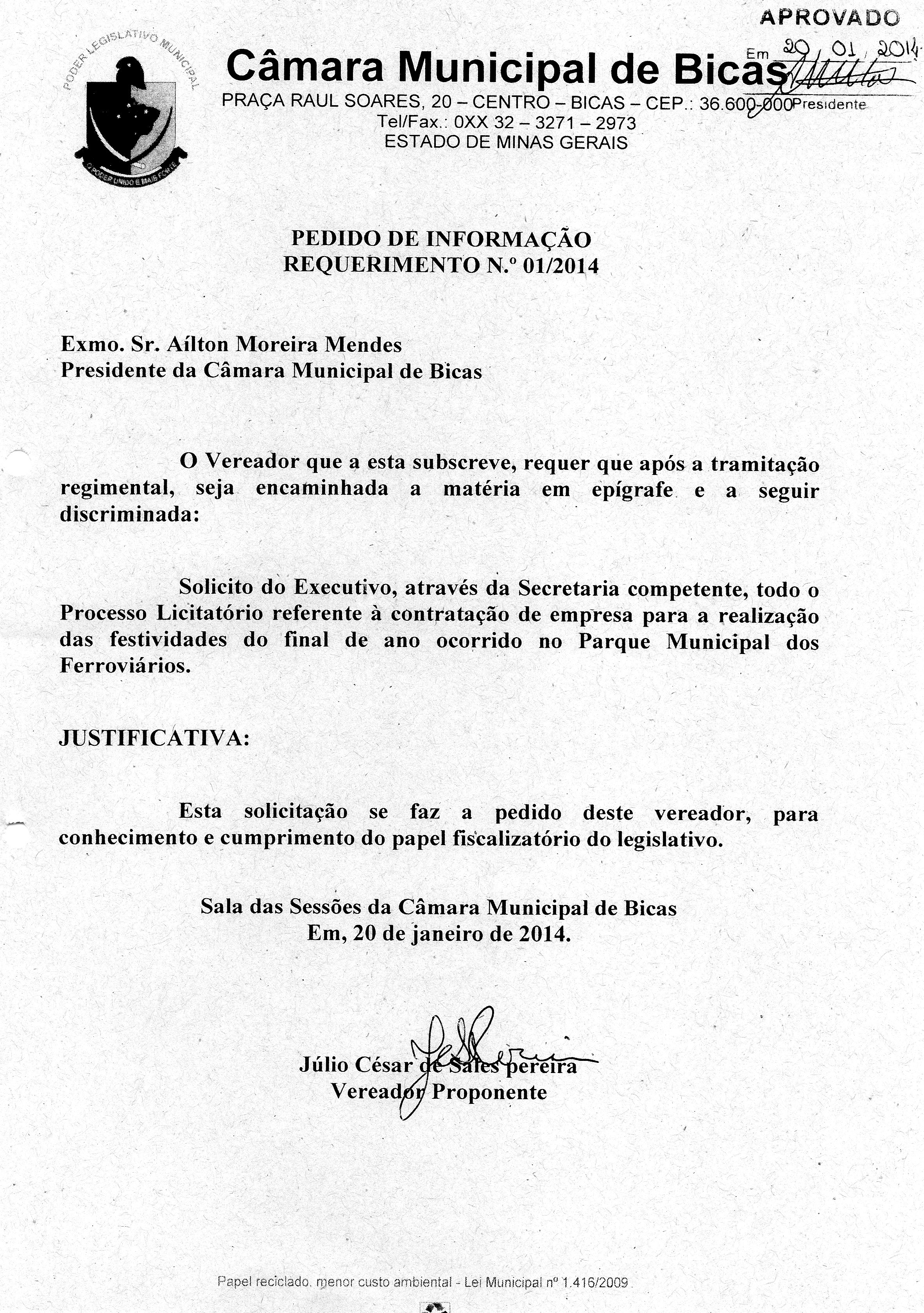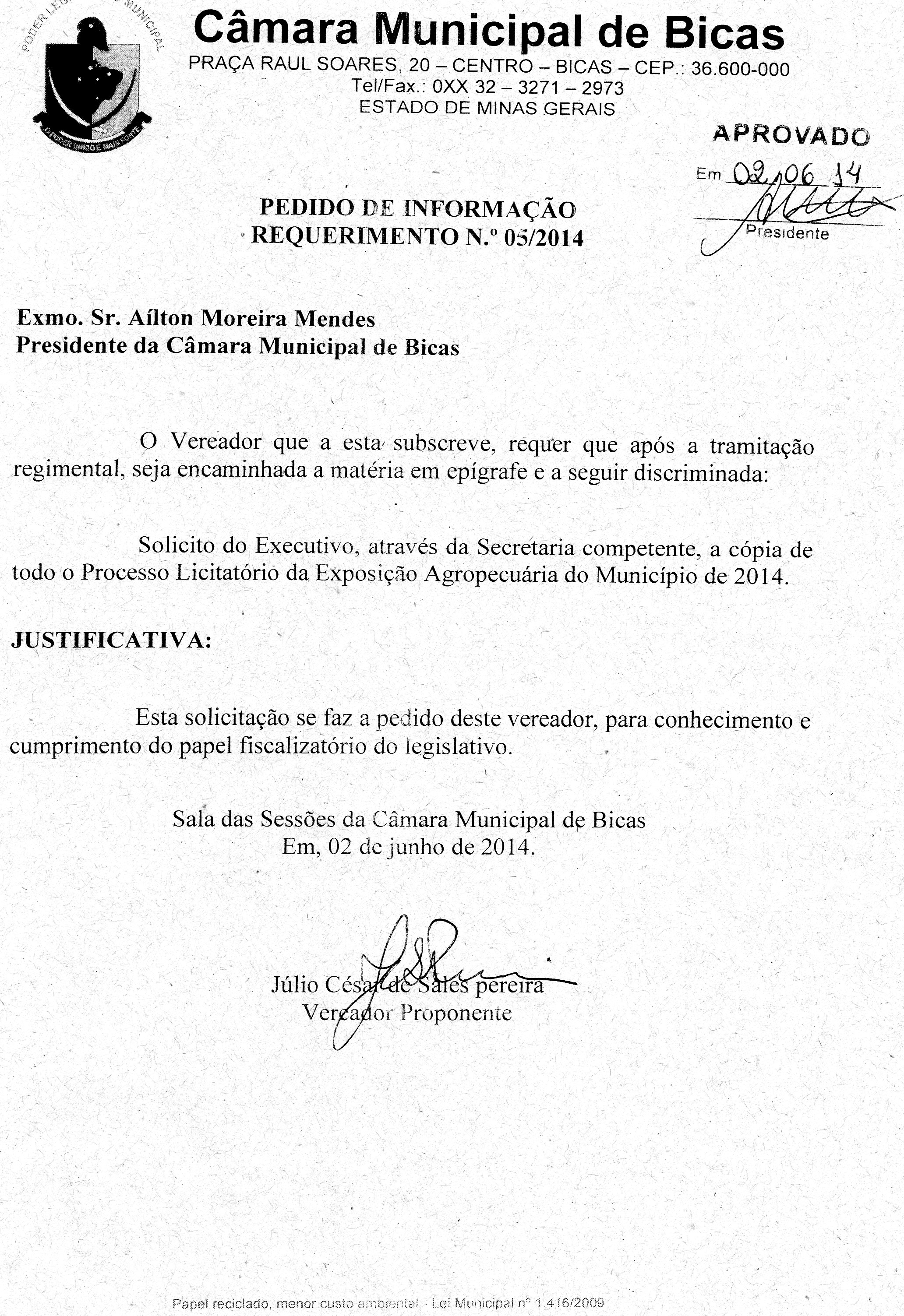 ![]() PEDIDO DE INFORMAÇÃO- PROCESSO LICITATÓRIO DA EXPOSIÇÃO AGROPECUÁRIA DO MUNICÍPIO DE BICAS DE 2014.