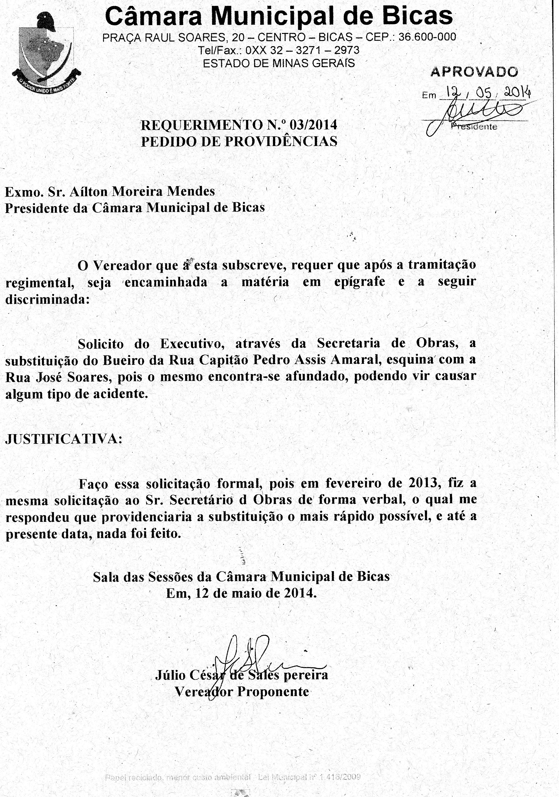 ![]() PEDIDO DE PROVIDÊNCIAS- SUBSTITUIÇÃO DO BUEIRO DA RUA CAPITÃO PEDRO ASSIS AMARAL.