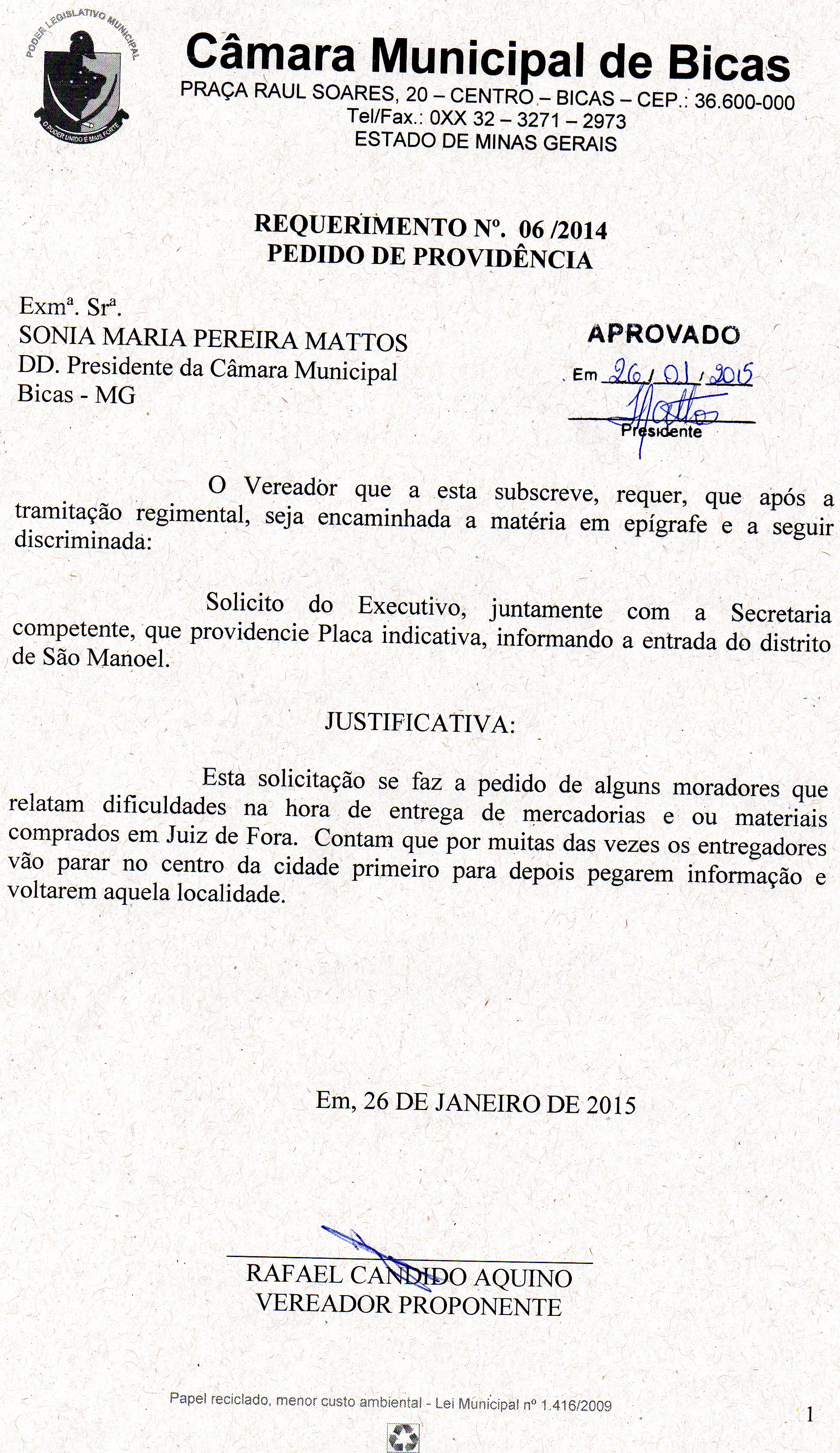 ![]() PEDIDO DE PROVIDÊNCIAS- PLACA INDICATIVA DO DISTRITO DE SÃO MANOEL.