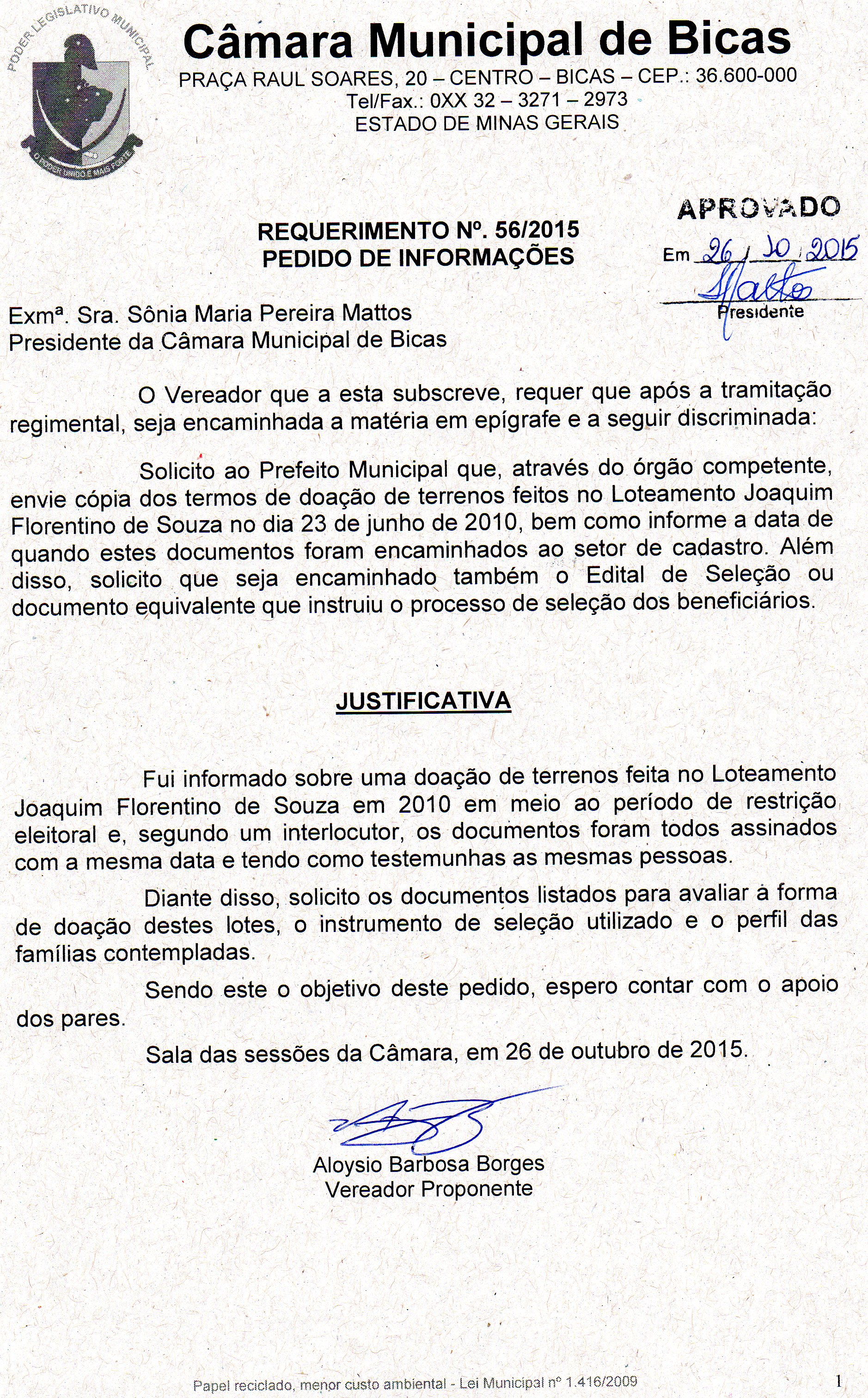 Ementa: PEDIDO DE INFORMAÇÕES - CÓPIA DOS TERMOS DE DOAÇÃO DE TERRENOS NO LOTEAMENTO JOAQUIM FLORENTINO DE SOUZA.