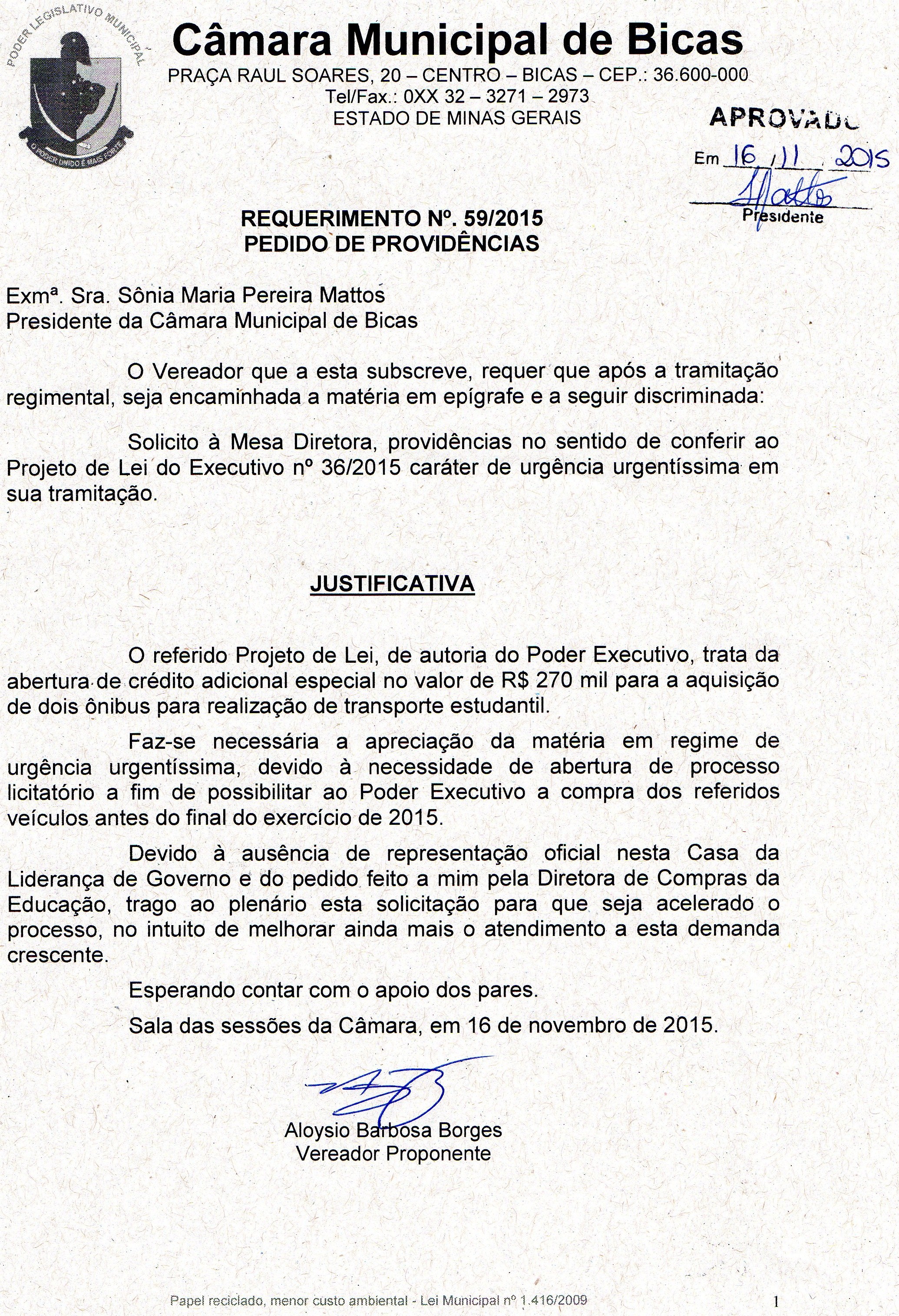 Ementa: SOLICITA CONFERIR CARÁTER DE URGÊNCIA URGENTÍSSIMA NA TRAMITAÇÃO DO PROJETO DE LEI Nº 36/2015.