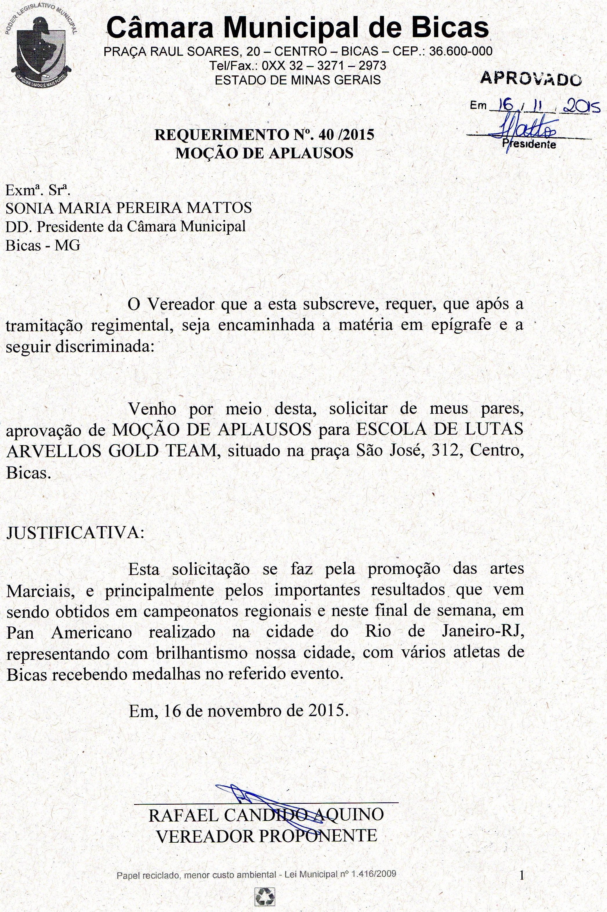 Ementa: MOÇÃO DE APLAUSOS - ESCOLA DE LUTAS ARVELLOS GOLD TEAM .