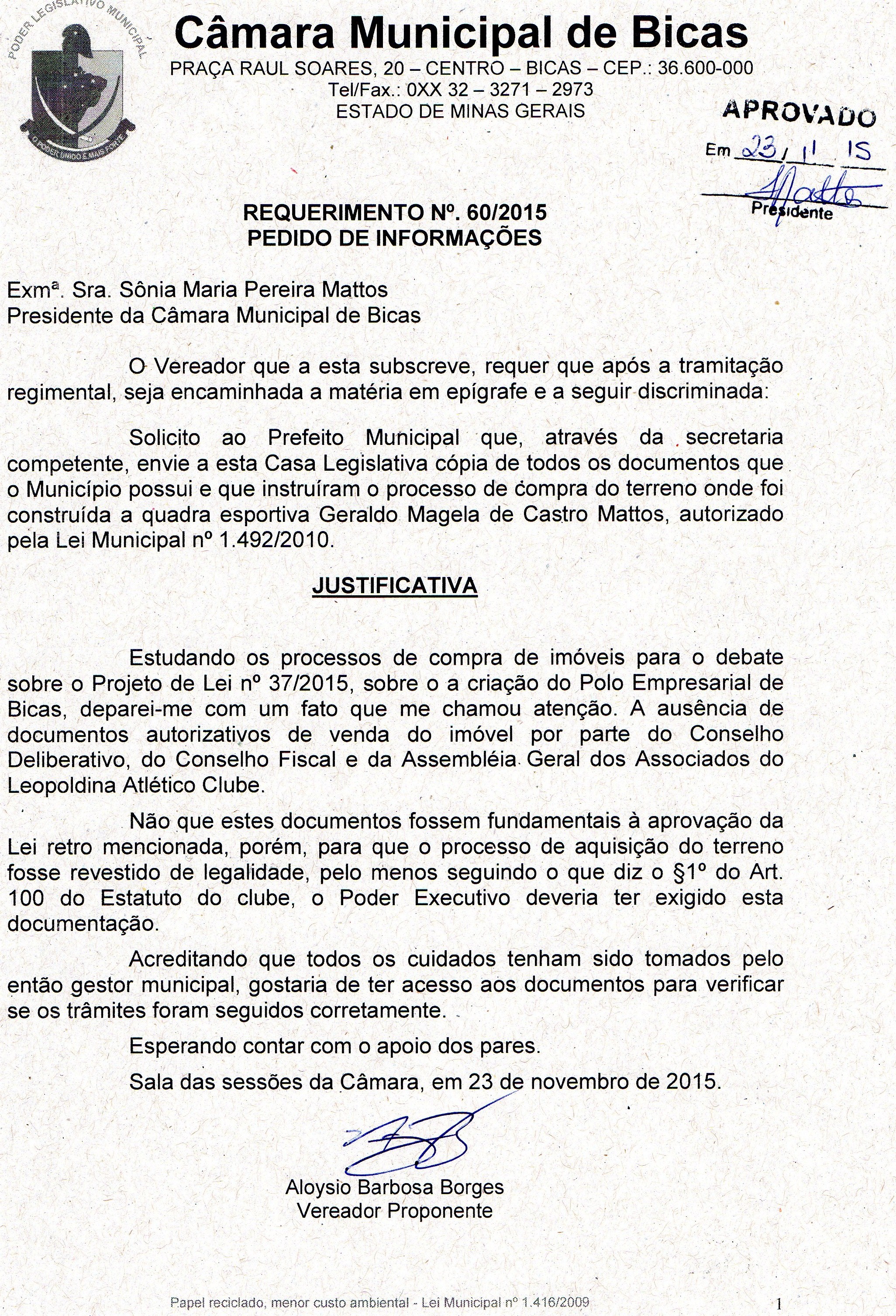 Ementa: PEDIDO DE INFORMAÇÃO - ENVIE A ESTA CASA LEGISLATIVA CÓPIA DE TODOS OS DOCUMENTOS QUE O MUNICÍPIO POSSUI E QUE INSTRUÍRAM O PROCESSO DE COMPRA DO TERRENO ONDE FOI CONSTRUÍDA A QUADRA ESPORTIVA GERALDO MAGELA DE CASTRO MATTOS , AUTORIZADO PELA LEI MUNICIPAL Nº 1.492/2010.